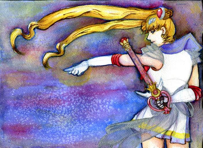 Painting of Sailor Moon doing her attack, Moon Gorgeous Meditation. 11x14 Arches watercolor paper with Daniel Smith watercolors.